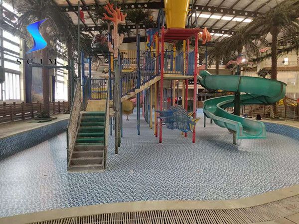 本項目位于北京市,為室內水上樂園項目,原基礎為馬賽克瓷磚,局部有脫落、開裂問題,采用1.5mm泳池膠膜施工安裝,采用滿刮膠工藝熱熔焊接。施工安裝之前瓷磚損壞部分做找平處理,泳池膠膜施工安裝完畢后,整體比較平整、美觀。現場效果如下:
